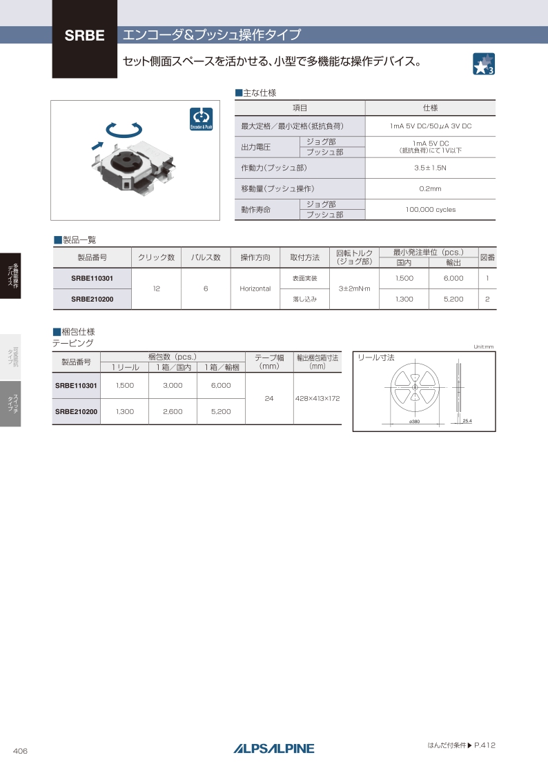 SRBE系列可以利用裝備側(cè)面空間的小型多功能裝置。功能:中央按動(dòng)和編碼器 ? 尺寸(W×D×H):8.05×11.0×2.35mm(表面貼裝式) ? 最大額定值:1mA 5V DC。
