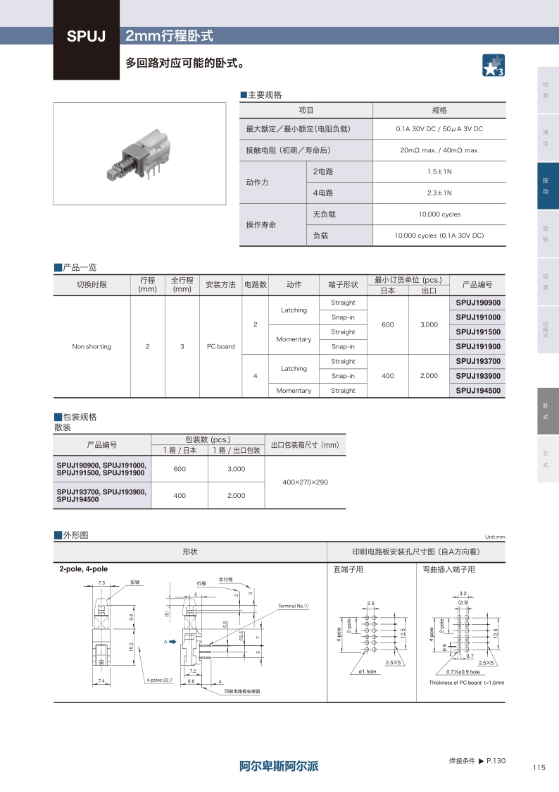 多回路對應(yīng)可能的臥式,操作方向:Horizontal ? 最大額定值:0.1A 30V DC ? 行程:2.0mm ? 電路數(shù):2/4-pole。