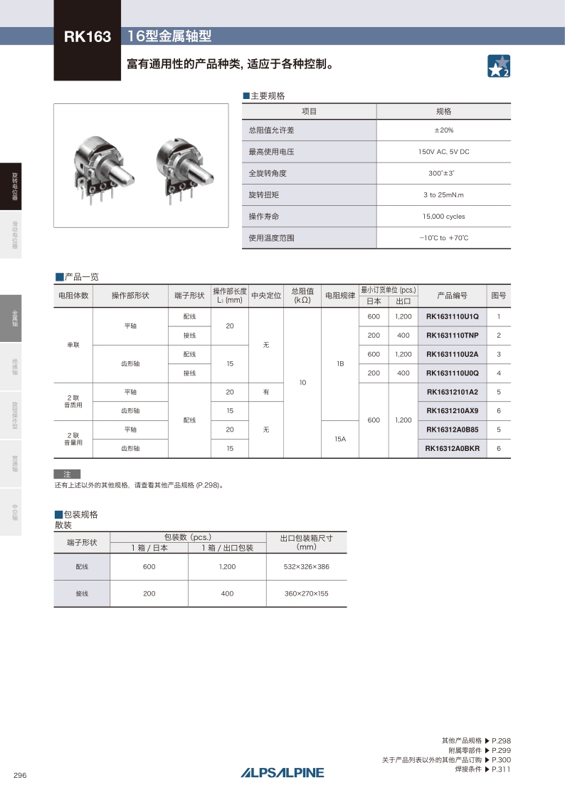 RK1631110U0Q 照片 1軸 單聯(lián) Horizontal 螺紋固定 齒形 接線 15mm 10kΩ 1B 16型