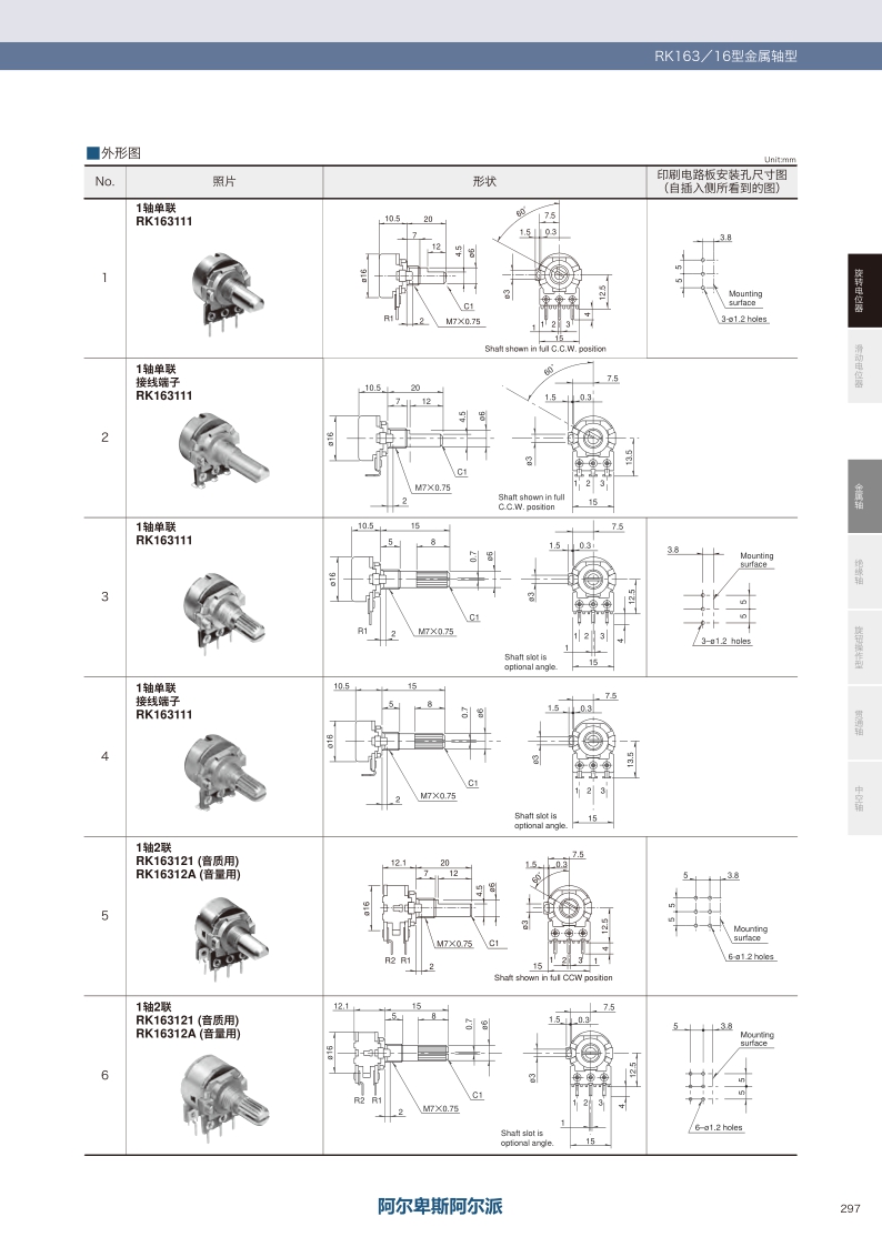 產(chǎn)品編號(hào) 照片 操作軸數(shù) 電阻體數(shù) 操作部方向 軸受固定方法 操作部形狀 端子形狀 操作部長(zhǎng)度 定位 總阻值 電阻規(guī)律 尺寸