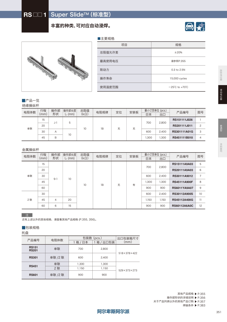產(chǎn)品編號 照片 電阻體數(shù) 安裝方向 行程 操作部形狀 操作部長度 總阻值 電阻規(guī)律 定位 安裝板