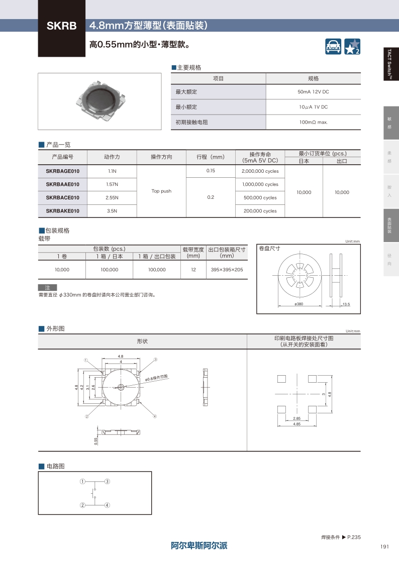 SKRBAKE010 照片 Surface mount 3.5N Top push 0.2mm 0.55mm 200,000 cycles 100mΩ max. 4.8×4.8×0.55