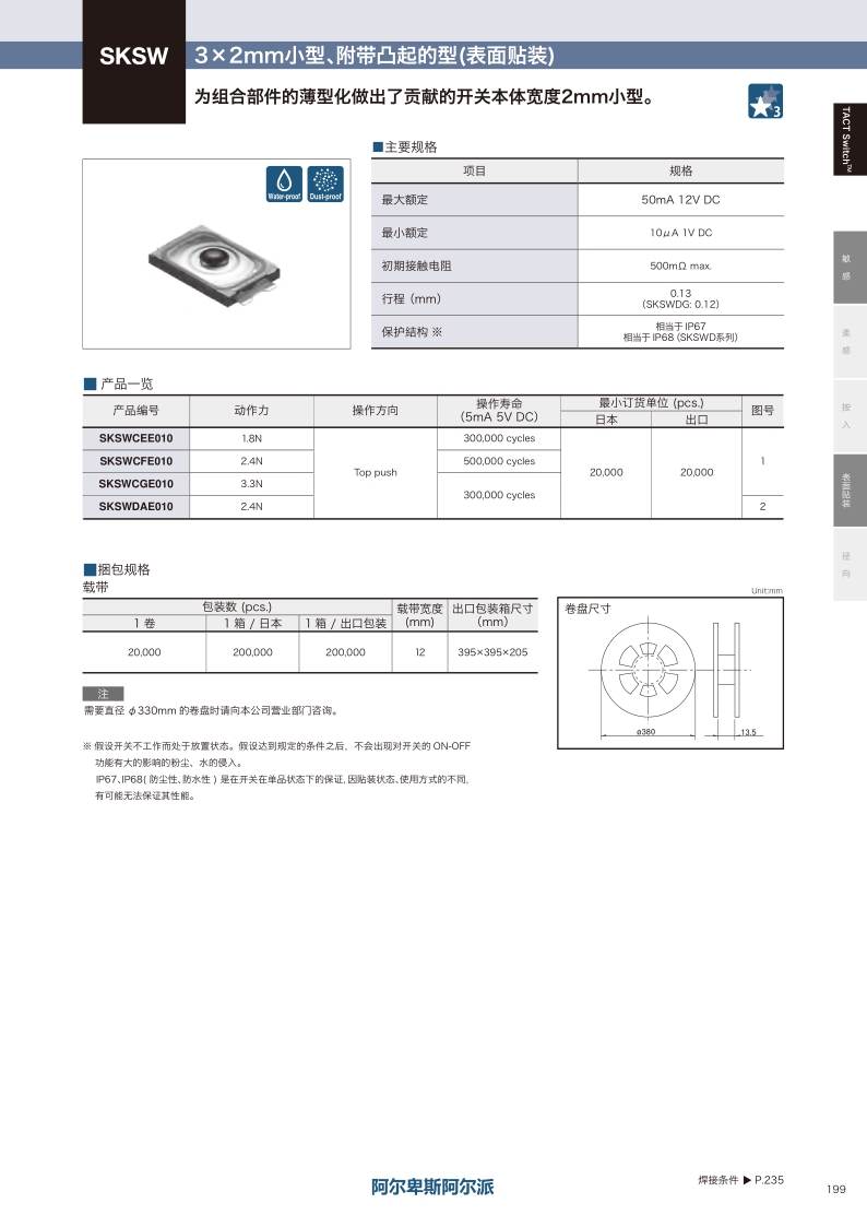 為組合部件的薄型化做出了貢獻的開關(guān)本體寬度2mm小型。操作感覺:敏感 ? 貼裝方式:表面貼裝 ? 尺寸(W×D×H):3.0×2.0×0.6mm ? 特長:小型?薄型 防水及防塵型 IP67(部分 IP68)。