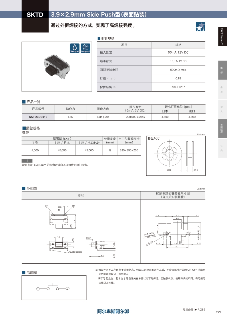 3.9×2.9mm Side Push型(表面貼裝)SKTD系列型號(hào):SKTDLDE010