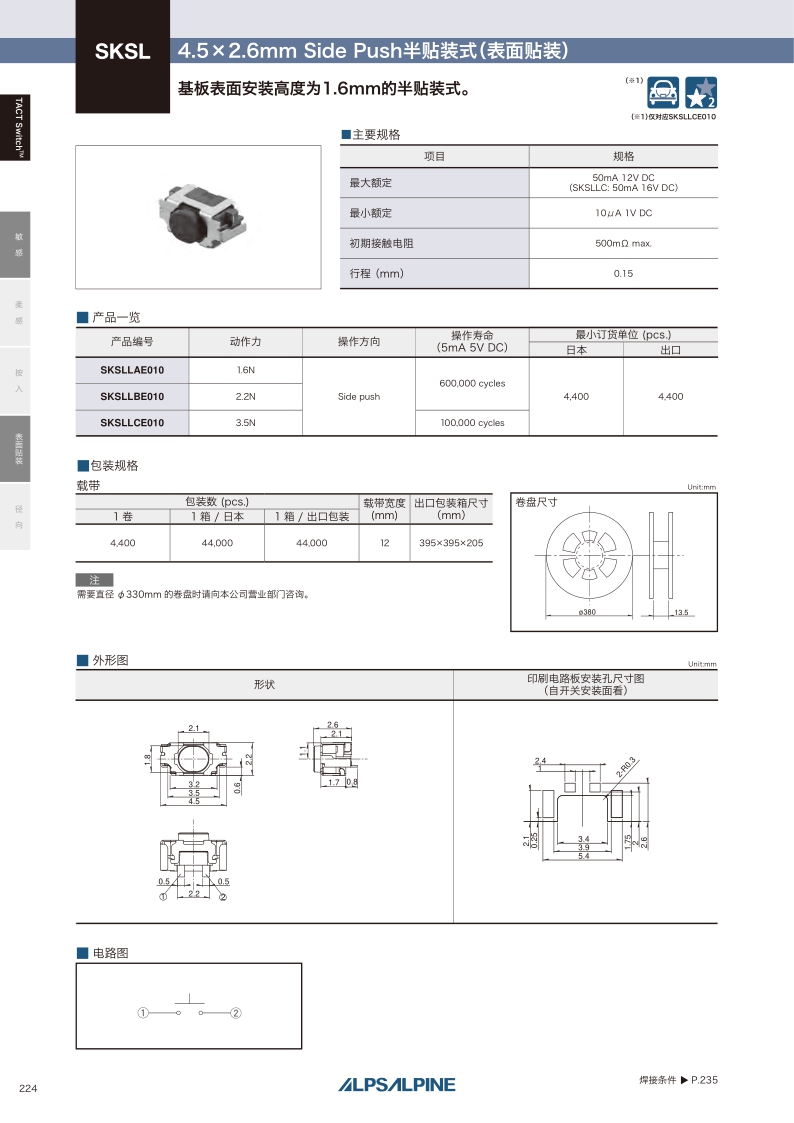 SKSLLAE010 照片 Surface mount 1.6N Side push 0.15mm 2.2mm 600,000 cycles 500mΩ max. 4.5×2.6×2.2