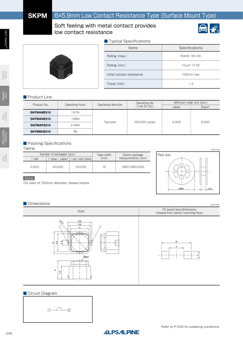 操作感覺(jué):柔感 ? 貼裝方式:表面貼裝 ? 尺寸(W×D×H):5.9×6.0×5.0mm ? 特長(zhǎng):低接觸電阻