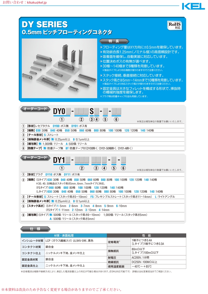 KEL浮動連接器 0.5mm間距板對板對板連接器KEL_連接器_浮動連接器.DY系列的間距為0.5mm,但在X和Y方向上可實現(xiàn)±0.5mm的移動間距同時還能保證1.25mm的有效嵌合高度??捎糜谲囕d多媒體、汽車液晶儀表盤、無人機云盤、LED顯示屏等。