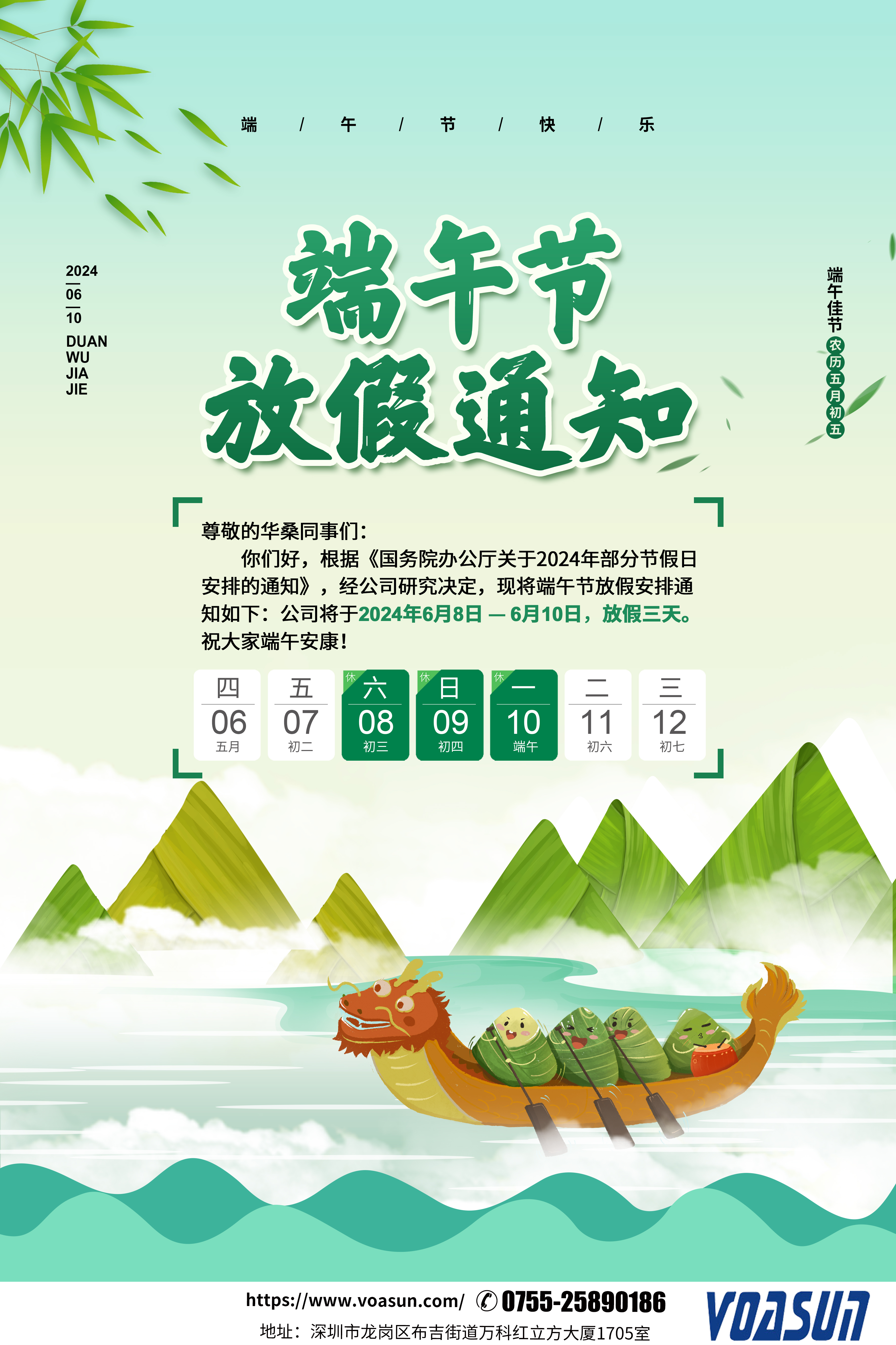 根據(jù)國(guó)家及公司相關(guān)規(guī)定,端午節(jié)放假安排:8日、9日、10日放假,共3天。