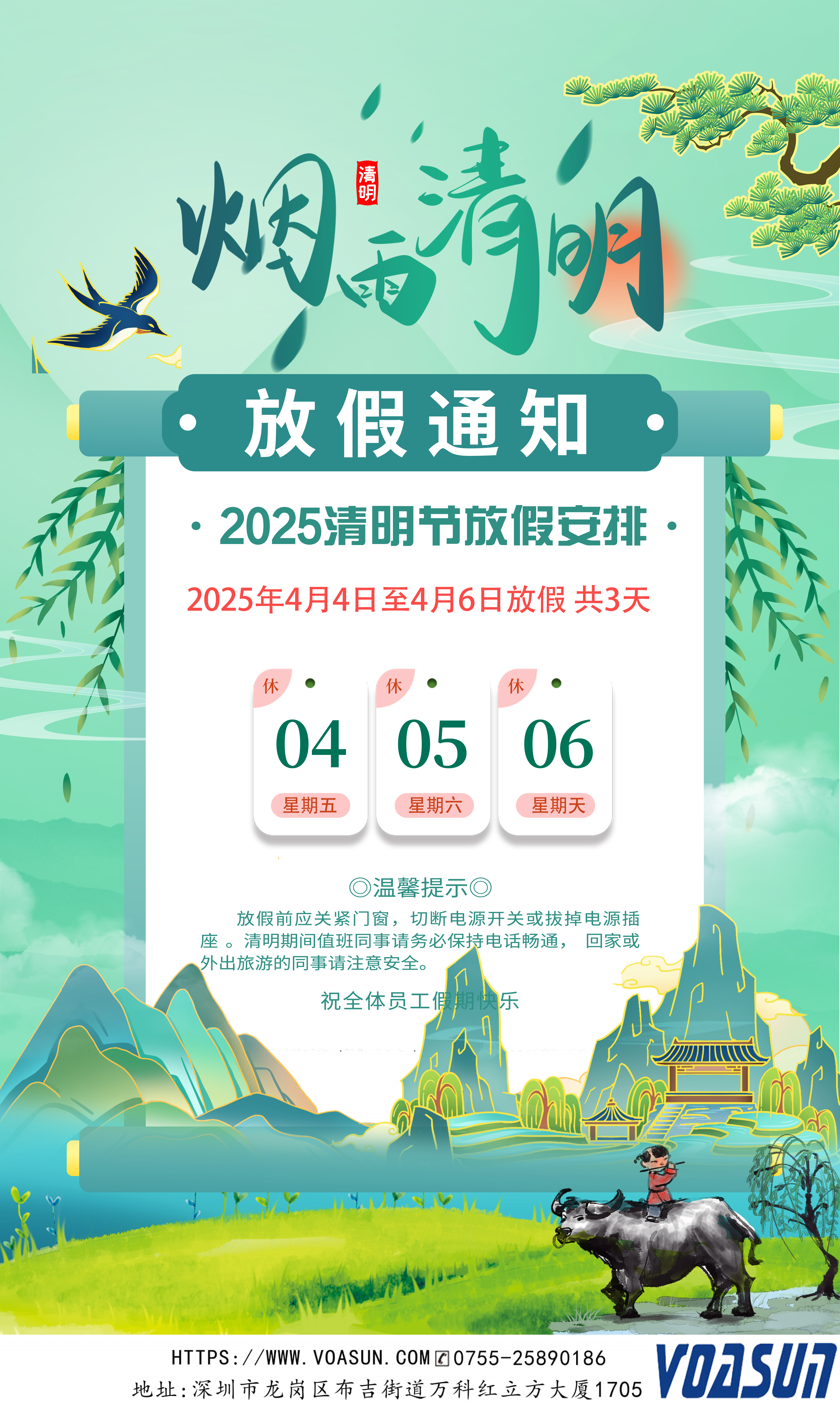 根據(jù)國家及公司相關(guān)規(guī)定,2025年清明節(jié)放假及調(diào)班安排:4月4日、5日、6日放假,共3天;不調(diào)班。